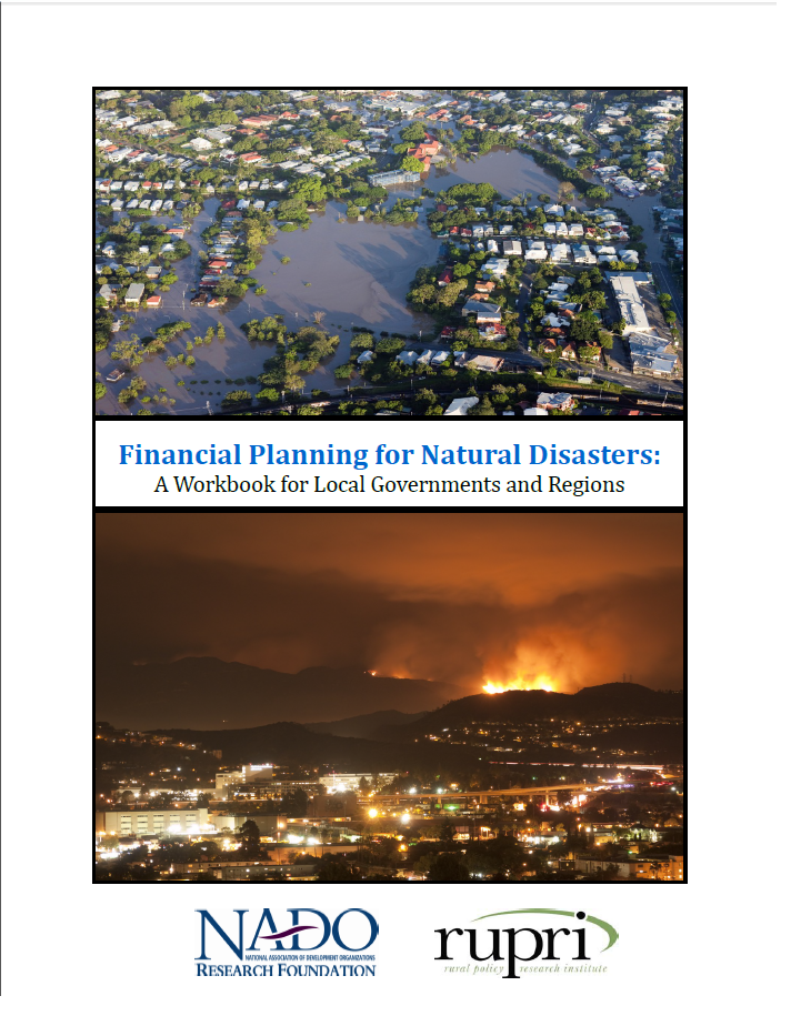 Is your community or region financially prepared for a natural disaster? RUPRI, with the support of the NADO Research Foundation through a grant with the U.S. Department of Housing and Urban Development, has released a new workbook, “Financial Planning for Disasters: A Workbook for Local Governments and Regions.” This workbook is designed to help local governments and regions understand their financial vulnerabilities to natural disasters, evaluate their financial capacity to cover the costs of those disasters, identify strategies to close the gap between financial vulnerability and capacity, and identify and address the spillover effects of neighboring local governments’ financial vulnerabilities to disasters.
