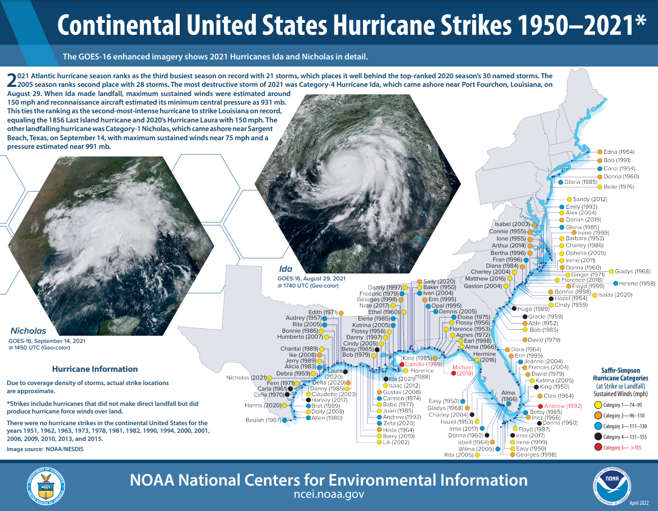 The National Oceanic and Atmosphere Administration (NOAA) offers valuable resources for EDOs to assess their vulnerability to hurricanes and other oceanic climate-related disasters. This includes OneStop, a data search tool that can be used to access any NOAA data with a metadata record. NOAA's National Center for Environmental Information also publishes a map showing the location of all hurricane strikes in the continental U.S. between 1950 and the present day. The most recent such map, seen at the top of the page, can be downloaded by clicking here. You can download monthly State of the Climate reports, Extreme Weather Information Sheets for twenty-two U.S. regions, and more by visiting NOAA's website at ncei.noaa.gov.